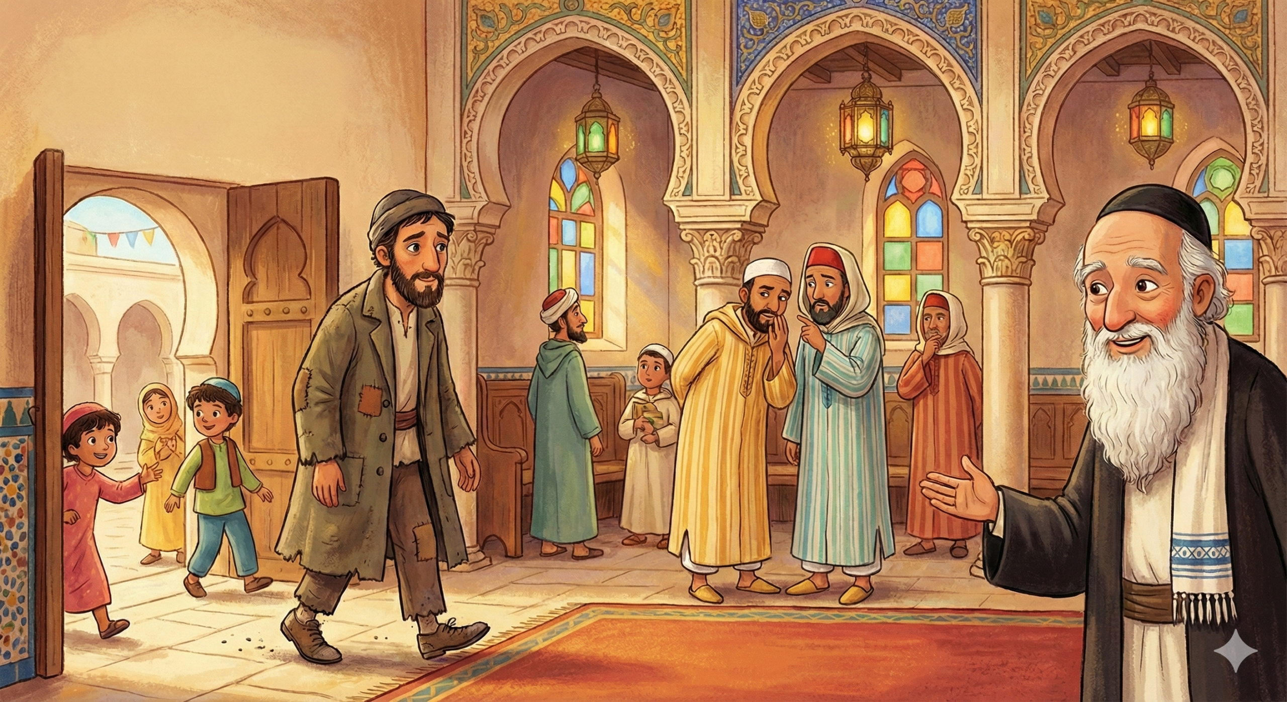 המתפללים בבית הכנסת שפטו את האיש לפי המעיל הישן והנעליים המאובקות – המעטפת החיצונית. לעומתם, הרב לימד אותם שהערך של האדם אינו נמדד בבגדיו, אלא בכוונת הלב שלו ובנשמה שבאה להתפלל.