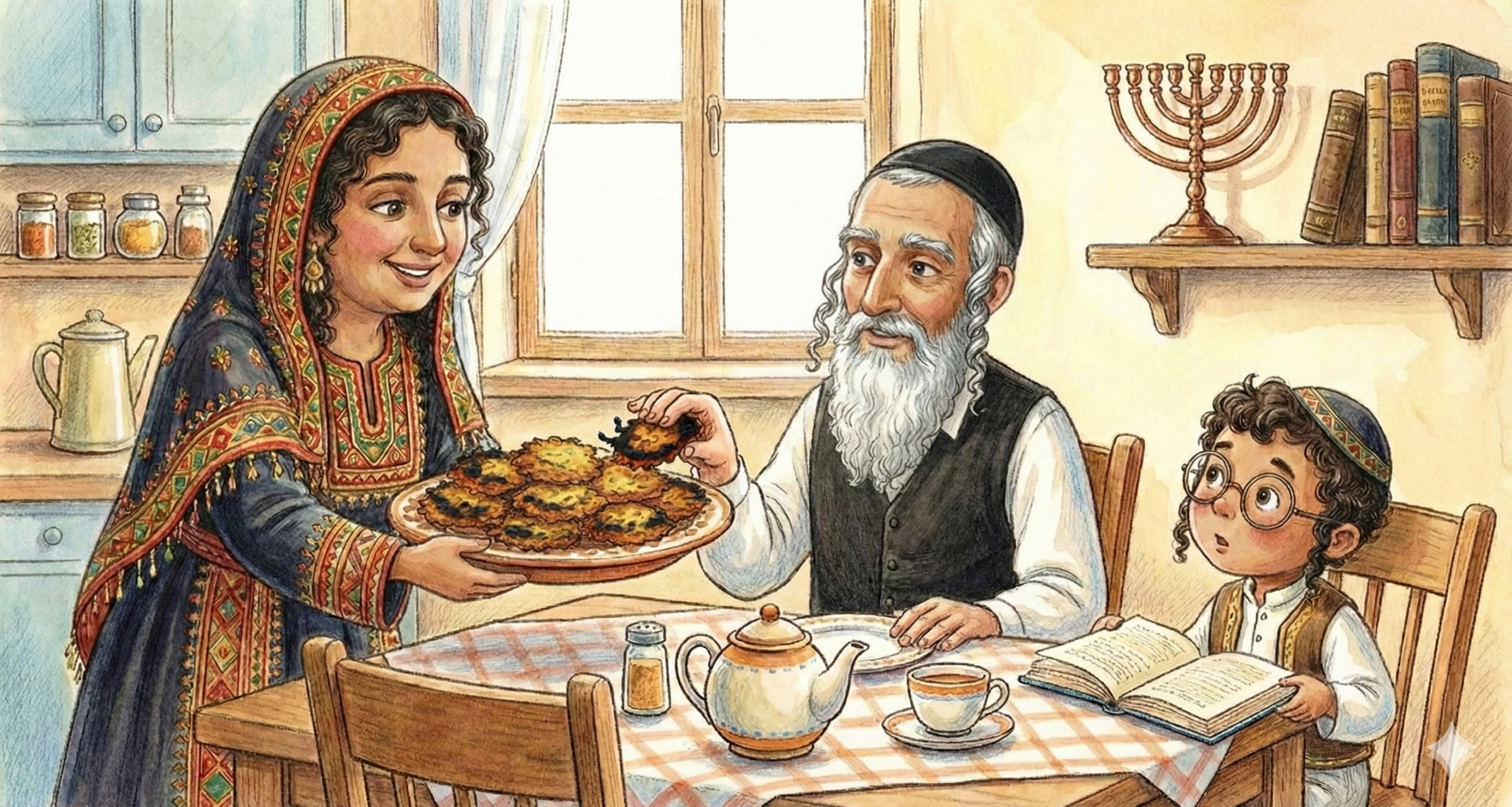 שָׁנִים עָבְרוּ. מֹשֶׁה גָּדַל וְהָפַךְ לְאִישׁ. יוֹם אֶחָד, כְּשֶׁעָמְדָה אִשְׁתּוֹ פְּנִינָה בַּמִּטְבָּח וְטִגְּנָה לְבִיבוֹת, אַחַת הַלְּבִיבוֹת נִשְׂרְפָה מְעַט בַּקָּצֶה. בְּאוֹתוֹ רֶגַע, הַזִּכָּרוֹן הִכָּה בּוֹ. הוּא נִזְכַּר בְּאַבָּא יִחְיֶא, בַּזָּקָן הַלָּבָן, וּבְצַלַּחַת הַלְּבִיבוֹת. פִּתְאוֹם, מֹשֶׁה הֵבִין.